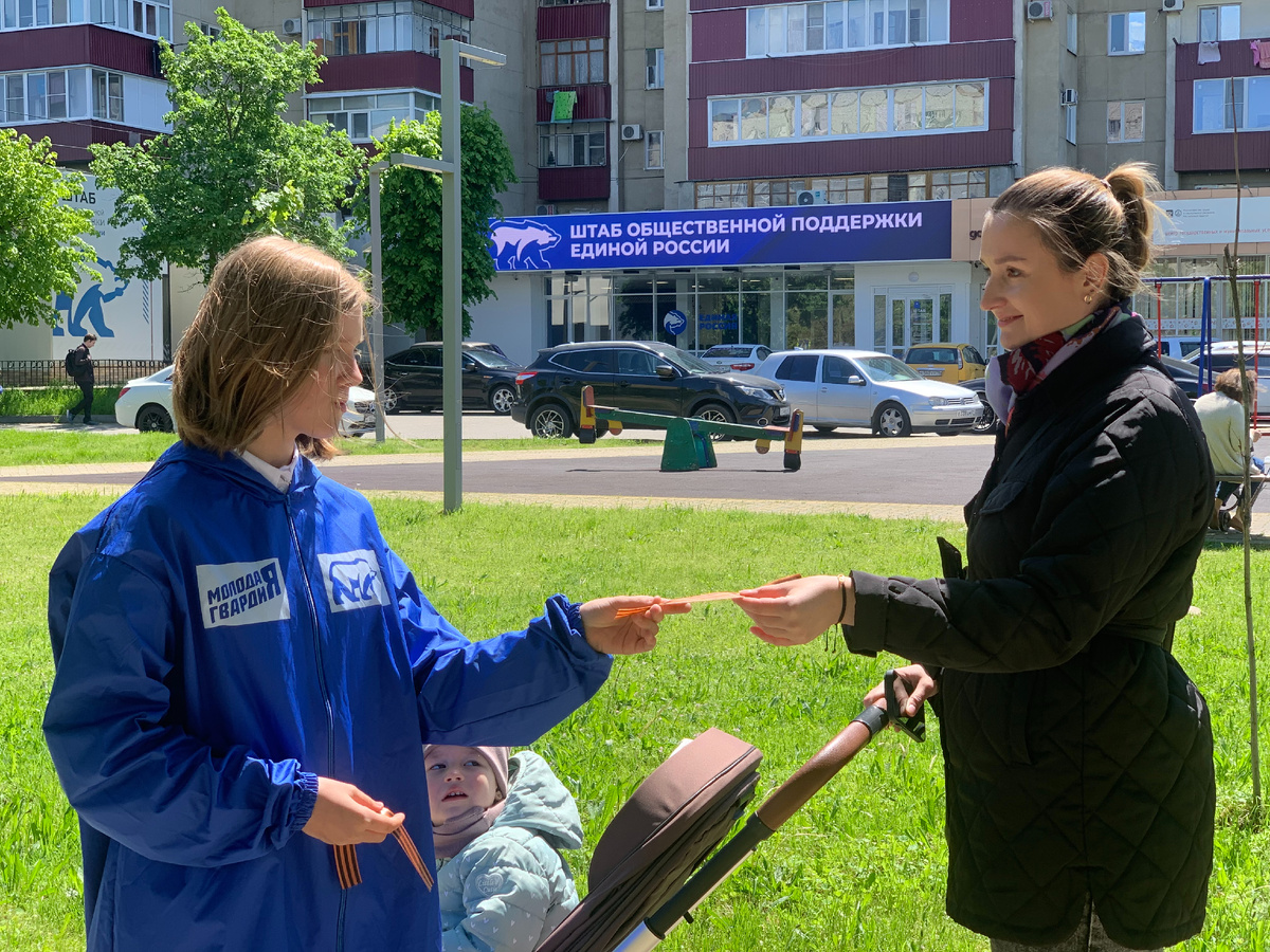 В преддверии Дня Победы на улицах Майкопа и центральных площадях активисты «Молодой Гвардии» и Штаба общественной поддержки раздают символ Победы в Великой Отечественной войне - Георгиевские ленточки.