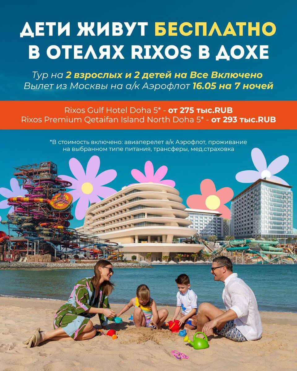 🌟 ДЕТИ ЖИВУТ БЕСПЛАТНО В ОТЕЛЯХ RIXOS В ДОХЕ ✈️Вылет из Москвы на а/к Аэрофлот 🗓 с 16.05 на 7 ночей 🍽️ питание: всё включено ⤵️Тур на 2 взрослых и 2 детей ⤵️ 🖊Rixos Gulf Hotel Doha 5* - от 275 тыс.RUB 🖊Rixos Premium Qetaifan Island North Doha 5* - от 293 тыс.RUB 🖊Проживание до 31 августа 2025 года *В стоимость включено: авиаперелет а/к Аэрофлот, проживание на выбранном типе питания, трансферы, мед.страховка Забронируйте заранее — и подарите семье отдых, который запомнится надолго ❤️ @life_travel_agent