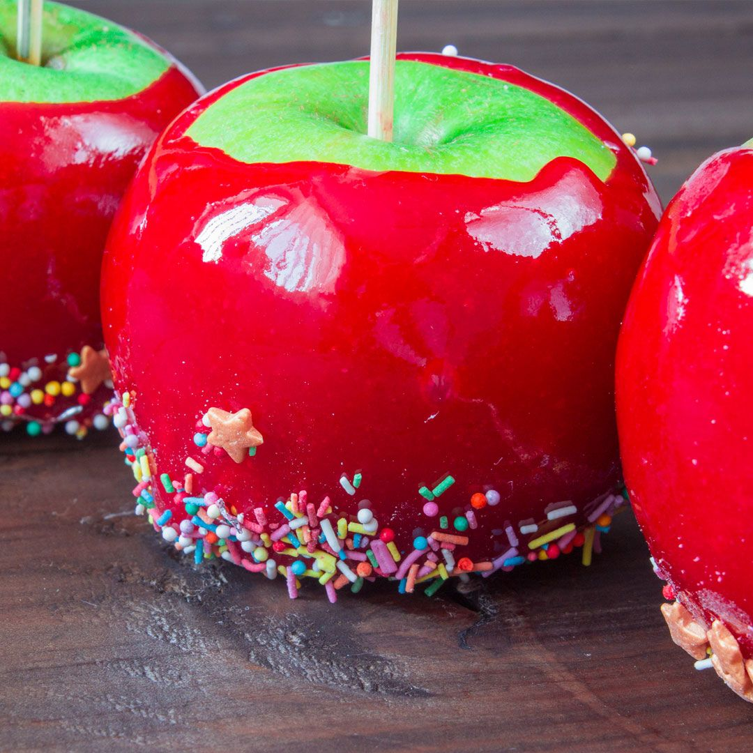 - Дальше опустите яблоко в кондитерскую посыпку. Переложите яблоко на ранее подготовленную плоскую тарелку.