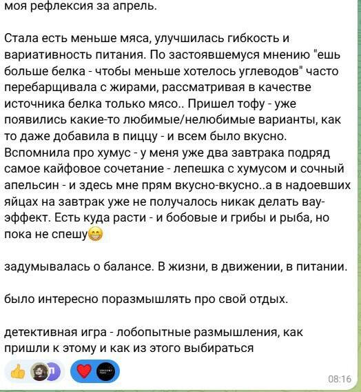 "Спасибо что создаете огонек, на который можно прийти и погреться, узнать новое и отпустить старое"🥹 Участница написала в чате клуба, я растрогана. Я рада, что у нас живая и любопытная атмосфера, где участники не просто читают, а пробуют, обсуждают, задают вопросы и находят свои решения! Хоть снизить вес, хоть поддержать здоровье, хоть разнообразить рацион - для каждого в клубе найдутся свои инструменты, чтобы сделать это по-своему, а не по шаблонной инструкции. А ещё: ➡️Я всегда рядом. Вы можете задать вопрос на любую тему о здоровье и получите обстоятельный ответ. ➡️Есть поддержка. В клубе люди, которые выстраивают питание и образ жизни, изучают его. ➡️Инструменты клуба - для любого уровня занятости, дохода или других обстоятельств, из-за которых вы могли бы отложить заботу о себе. По ссылке подробности. Вход в тусовку откроется 15 мая.