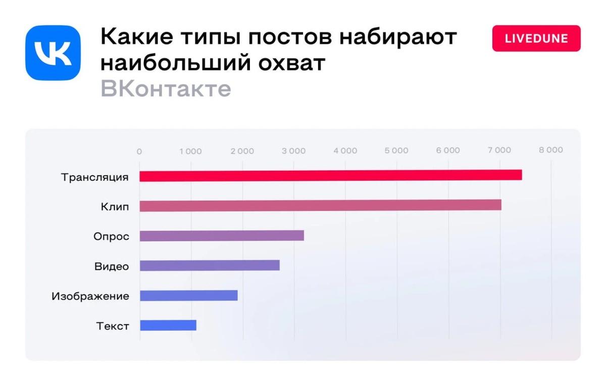 Трансляции в топе: как тип поста влияет на охваты ВКонтакте? Трансляции получают наибольший охват, а вот текстовые публикации, кажется, в ленте ВКонтакте мало кто видит. В новом исследовании специалисты сервиса аналитики и управления соцсетями LiveDune оценили, как на итоговый охват влияет тип поста. И чем вызвана эта разница.