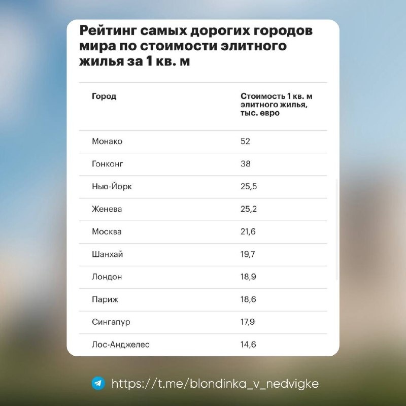 Москва вошла в топ-5 самых дорогих городов мира по цене элитной недвижимости. 2 миллиона рублей за квадратный метр — или 21 600 евро.