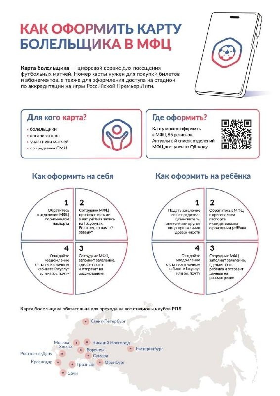 Карта болельщика является пропуском на футбольные матчи Российской премьер-лиги. С её помощью можно приобретать билеты и абонементы. Карта выпускается в электронном виде, она доступна в личном кабинете на портале госуслуг в разделе «Карта болельщика» www.gosuslugi.ru/fancard После приобретения билета и назначения владельца сформируется QR-код для входа на стадион. По чужому QR-коду пройти нельзя. Карту болельщика можно оформить: - в любом центре «Мои документы». Для этого требуется учетная запись на портале госуслуг. С собой необходимо взять документ, удостоверяющий личность - в мобильном приложении «Госуслуги» - в мобильном приложении «Болельщик» - онлайн на портале госуслуг. Получить Карту болельщика можно и на детей до 14 лет. О порядке оформления Карты смотрите далее