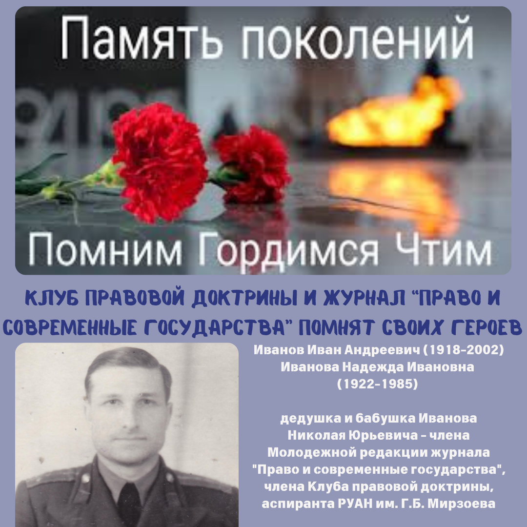 Иванов Иван Андреевич (1918-2002) и Иванова Надежда Ивановна (1922-1985) участвовали в Великой Отечественной войне и служили вместе в 17-й Воздушной армии 3-го Украинского фронта. Иванов Иван Андреевич в ВС с 1937 года, штурман ВВС СССР, совершил за годы ВОВ множество разведывательных и боевых вылетов на самолетах ПЕ-2, СБ, Ю-52, ЯК-6. Во время войны он также преподавал навигационное дело и бомбометание, подготовил более 100 командиров звеньев. Войну закончил в звании капитана, продолжил службу и вышел в отставку в звании майора. Имеет медали и 2 Ордена Красной звезды. Иванова Надежда Ивановна служила сержантом-техником Отдельного батальона авиационно-технического обеспечения в той же 17-й Воздушной армии. Дедушка и бабушка члена Молодежной редакции журнала "Право и современные государства", члена Клуба правовой доктрины, аспиранта РУАН им. Г.Б. Мирзоева Иванова Николая Юрьевича.