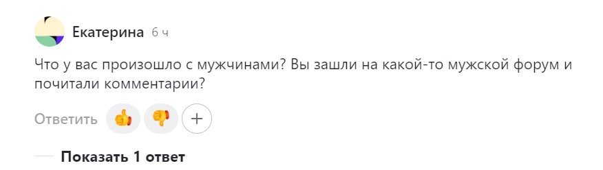 Вчера прилетел такой интересный вопрос после того, как на моем канале появилась новая рубрика "Мужское-женское": Вообще ни на какой мужской форум не ходила и ничего не изменилось. Ничего не произошло, кроме того, что я завела новую рубрику на канале, где хочу писать про то, что мне интересно. Никаких обид на мужчин у меня нет, более того, нередко в наше время я испытываю к ним сочувствие. Ну, к тем, кто адекватный, конечно, а не к тем, кто пишет вот такие вот комментарии, как в этой моей публикации: Новая рубрика - это лишь способ разнообразить контент на моем канале и, возможно, привлечь новых читателей, увеличить количество дочитываний моих публикаций, обсудить интересные темы с читателями. Никаких претензий к мужчинам у меня нет, а почитывать статьи и комментарии на тему отношений - это со мной случалось и раньше, случается и сейчас. Мне кажется, даже когда (или если) мне будет 85, эта тема не будет мне совсем уж безразлична. Я не являюсь мужененавистницей. Я - за равные права