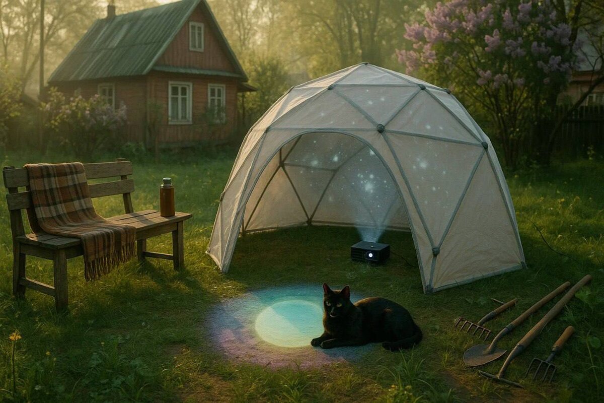 Утро было бодрым. Птицы спорили — как будто делили градусы куспида третьего дома. Я вышел с кружкой чая и увидел: что-то необычное. За соседским забором возвышалась странная полусфера. Не то палатка, не то теплица. Больше всего это напоминало защитный купол. Я сразу понял — это дело рук Олега Петровича. Бывший астроном, теперь — дачник с философией. Каждую весну у него новый эксперимент: то диаграммы на земле из шишек, то вращающиеся антенны, то лунный компас из крышек от варенья. На этот раз — купол. И это обещало быть интересно. Из-за конструкции донёсся скрип штативов, щелчки слайдов — и голос: — Так, если мы сдвинем Орион на два градуса к западу, у нас уйдёт оппозиция. А с сегодняшним соединением Луны с Марсом это особенно важно. Я решил сходить рассмотреть поближе. Олег Петрович, как всегда, был сосредоточен и вдохновлён. — Каждое утро я корректирую звёздное небо, — сообщил он. — Потому что звёзды — это, конечно, хорошо. Но они иногда... ну, как тебе сказать... сбиваются с рит