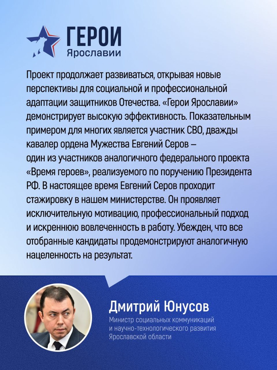 В Ярославской области продолжается отбор на кадровый проект «Герои Ярославии» Ветераны боевых действий и бойцы СВО уже прошли онлайн-тестирование на управленческие качества. Почти из 300 участников успешно справились с испытанием 120 человек, в числе которых — две женщины. Следующий этап — собеседования, которые начнутся 5 мая и продлятся месяц. Те, кто не прошел отбор, получат помощь с обучением и трудоустройством. А для тех бойцов, которые по объективным причинам не смогли принять участие в программе сейчас, предусмотрен второй набор. Проект «Герои Ярославии» создан для поддержки участников СВО. После прохождения всех конкурсных этапов прошедшие отбор получат возможность трудоустроиться в органы государственной власти, на предприятия и в социальные учреждения региона.