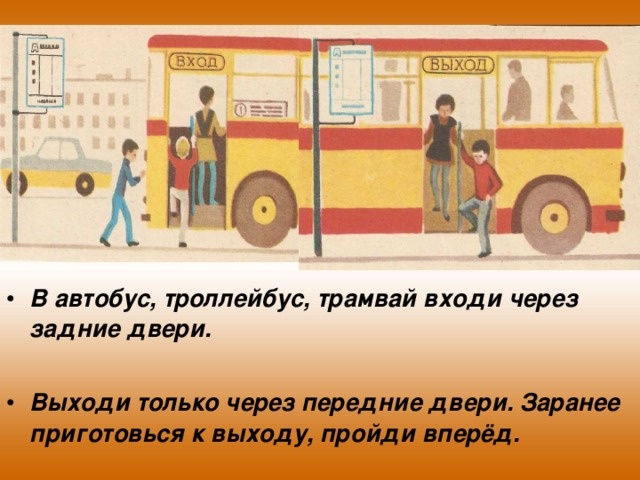 Задняя дверь — это вход. А передняя — это выход. И стоит либо крикнуть водителю остановиться на остановке, либо приготовиться к выходу заранее, если уже человек приготовился к выходу заранее. Но какой-нибудь то можно и не готовиться к выходу заранее.