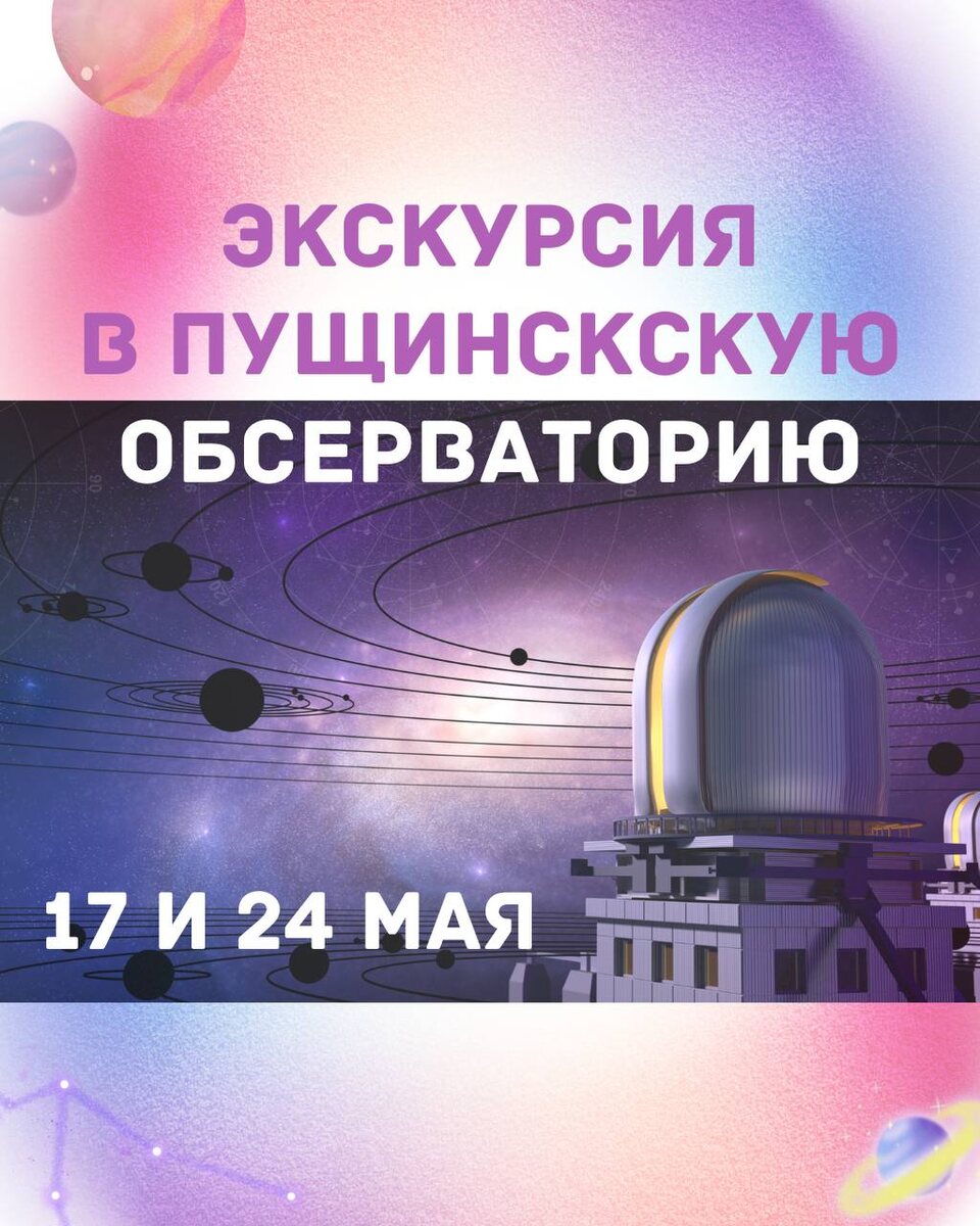 🟣 Посетите Пущинскую радиоастрономическую обсерваторию! ⠀ 📆 17 и 24 МАЯ 📍 Сбор у м. Чертановская в 9:30 ⠀ Один из крупнейших радиоастрономических центров нашей страны откроет двери для нас и покажет, как сотрудники «слушают» звёзды. Стоимость: ✅ 2300 рублей для взрослых ✅ 2000 рублей для детей до 18 лет, студентов и пенсионеров. ⠀ В стоимость входит: ✔ трансфер от м. Чертановская и обратно ✔ экскурсия по трём телескопам ✔ небольшая лекция ⠀ Мы увидим 3 крупных действующих радиотелескопа: ⠀ 🔭 БСА (большая сканирующая антенна) — самый чувствительный радиотелескоп в своём диапазоне. Основная «рабочая лошадка» обсерватории: 70% данных сотрудники ПРАО получают именно с него. 🔭 РТ-22 (радиотелескоп диаметром в 22 м) — один из старейших телескопов в России — более 60 лет в эксплуатации. С его помощью исследуют области звездообразования по наблюдениям атомарных и молекулярных радиолиний. 🔭 ДКР-1000 (диапазонный крестообразный радиотелескоп, 1000 метров) — с его помощью проводят исследо