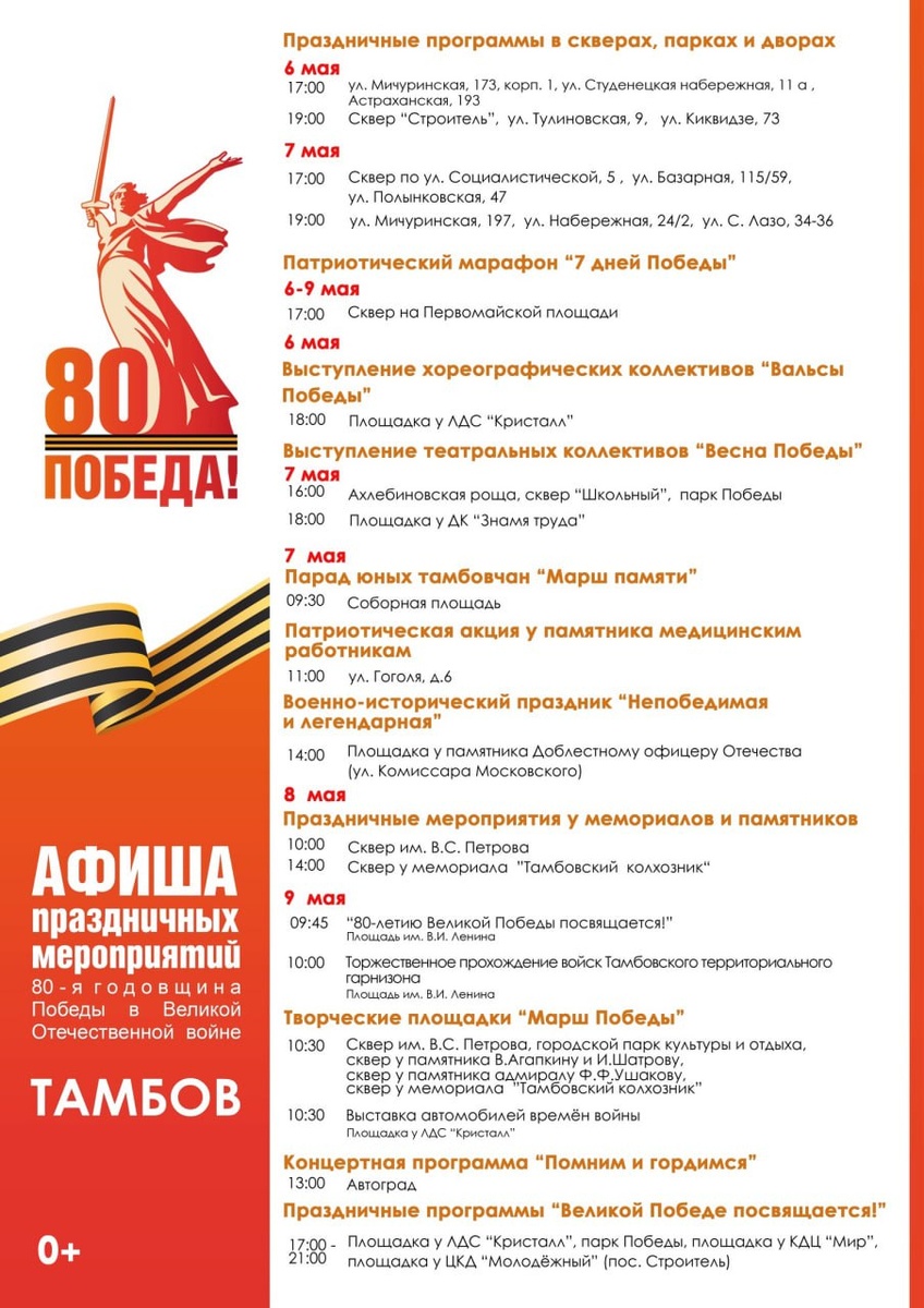 9 мая Тамбовская область вместе со всей страной будет праздновать 80-летие Победы в Великой Отечественной войне. В Тамбове подготовили насыщенную праздничную программу. Концерты пройдут в разных частях областного центра.
