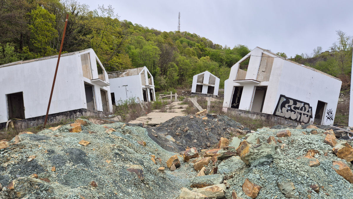 Всем привет! В самом конце улицы Новошкольной располагался красивый и очень аккуратный коттеджный поселок. Дома носили адрес ул. Новошкольная , 60/1, 60/2 и т.д. Были даже буквенные литеры. 5 октября 2021 года продолжался обычный осенний дождь. Он пропитал склон бывшего огромного оползня, на краю которого вырос элитный коттеджный поселок "Горная Поляна". Мало кто в этот момент задумывался, что наступил критический момент. Тяжелый коттеджный поселок перевесил точку стабилизации грунта. Ближе к 3 часам ночи земля пришла в движение и вся улица поползла вниз по склону. Надо отдать должное строителям, несмотря на то, что поселок был построен в оползневой зоне, сами дома возводились качественно! Ни один не разрушился, это позволило избежать жертв. Дома и сейчас выглядят так, словно их строят. Капитальные строения. Благо, что разрушительный оползень двигался медленно. Оторвавшись от склона тело оползня стало смещаться вниз по склону. Это длилось больше двух часов... в первый день. Двери хл