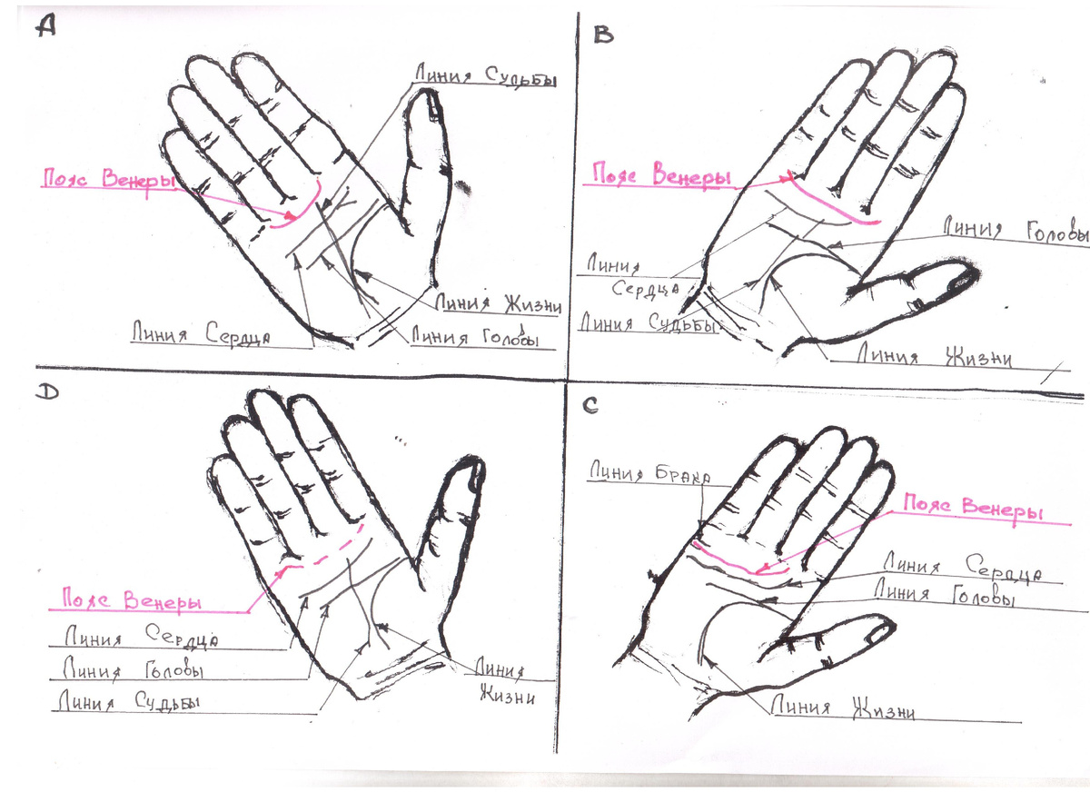 Суждения хиромантов о значении Пояса Венеры весьма разные, но я продолжаю настаивать, что значение Пояса Венеры зависит не только от расположения этого знака на ладони, но и от формы руки, на которой имеет место быть такой знак. Пояс Венеры имеет форму полукруга, и располагается на холмах у основания пальцев. (см. рис.33) Рассмотрим три основных позиции расположения Пояса Венеры, если такой знак имеется на ладони: 1-я позиция – Пояс Венеры начинается между первым и вторым пальцем и заканчивается между третьим и четвертым пальцем (рис. 33 А); 2-я позиция – Пояс Венеры проходит под основанием всех бугров – от бугра Юпитера до бугра Меркурия (рис.33 В); 3-я позиция – Пояс Венеры берет начало от холма Юпитера, либо между первым и вторым пальцем, а заканчиваться под линией брака(рис.33 С) Пояс Венеры в хиромантии означает: 1) Если Пояс Венеры находится на узкой длинной руке, охватывая 2-й и 3-й палец (рис.33 А). В этом случае Пояс Венеры нельзя считать неблагоприятным знаком, т.к. он ли