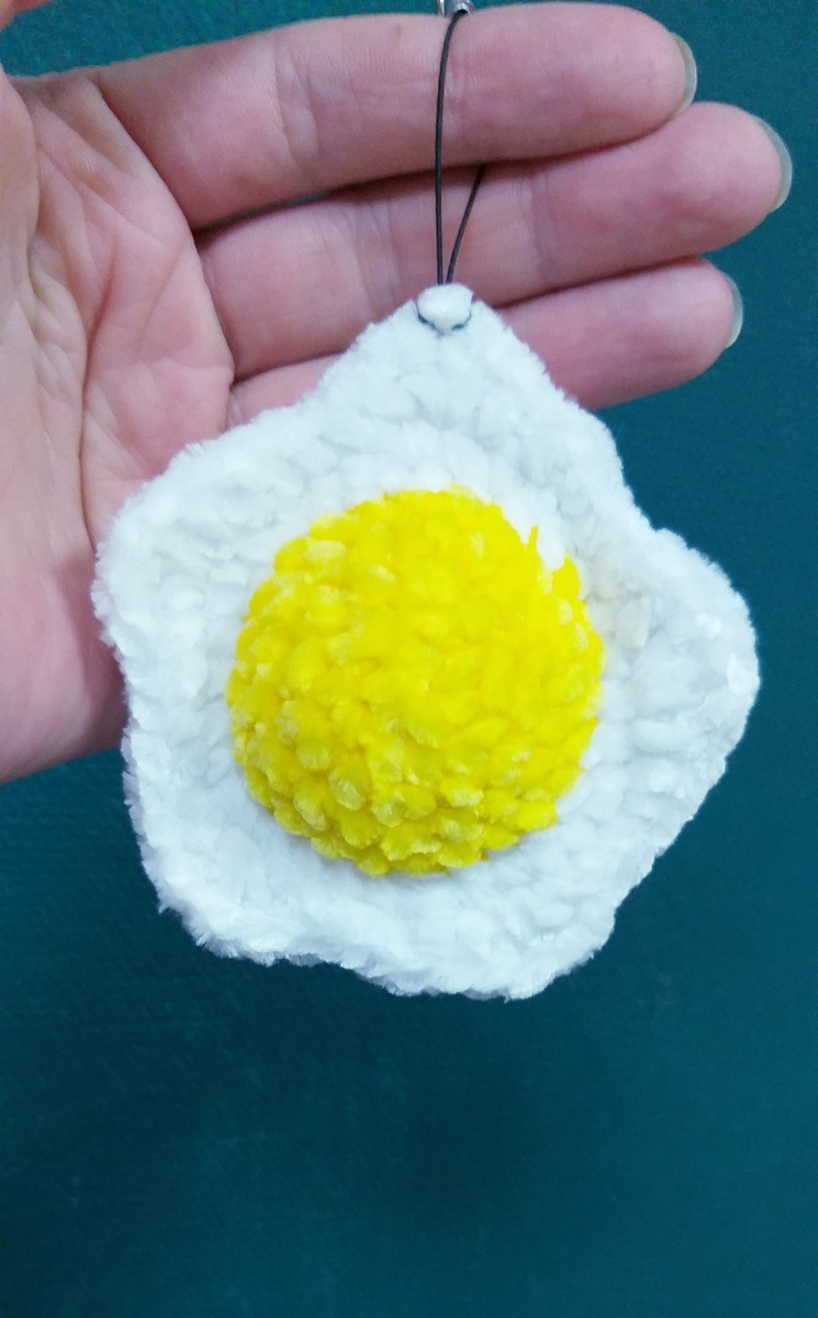 Рецепт "вкусной" яичницы прост: Нам понадобится: любая пряжа желтого и белого цветов (у меня велюр 100гр/160м) основа для брелка, немного наполнителя, крючок, соотетствующий размеру пряжи. Обозначения: - ка: кольцо амигуруми - сбн: столбик без накида - псн: полустолбик с накидом - ССН: столбик с накидом - уб: убавка - пр: прибавка Ход работы: Желток: 1 ряд: 6 сбн в ка (6) 2 ряд: 6 пр (12) 3 ряд: (1 сбн, пр)*6 (18) 4 ряд: (2 сбн, пр)*6 (24) 5 ряд: 24 сбн (24) Обрезаем нить Белок: 1 ряд: 6 сбн в ка (6) 2 ряд: 6 пр (12) 3 ряд: (1 сбн, пр)*6 (18) 4 ряд: (2 сбн, пр)*6 (24) Складываем 2 детали вместе изнанкой друг к другу, продолжаем вязание белой нитью, соединяя обе детали вместе (на этом этапе через небольшое отверстие набиваем деталь наполнителем) 5 ряд: (3 сбн, пр)*6 (30) 6 ряд: (4 сбн, ар)*6 (36) 7 ряд: (1 сбн, 2 псн, 3 ссн в 1 петлю, 2 псн, 1 сбн)*5 Заканчиваем вязание, закрепляем нить. Прикрепляем основу для брелка. Брелок - яичница готов. Ровных петелек, друзья ❤