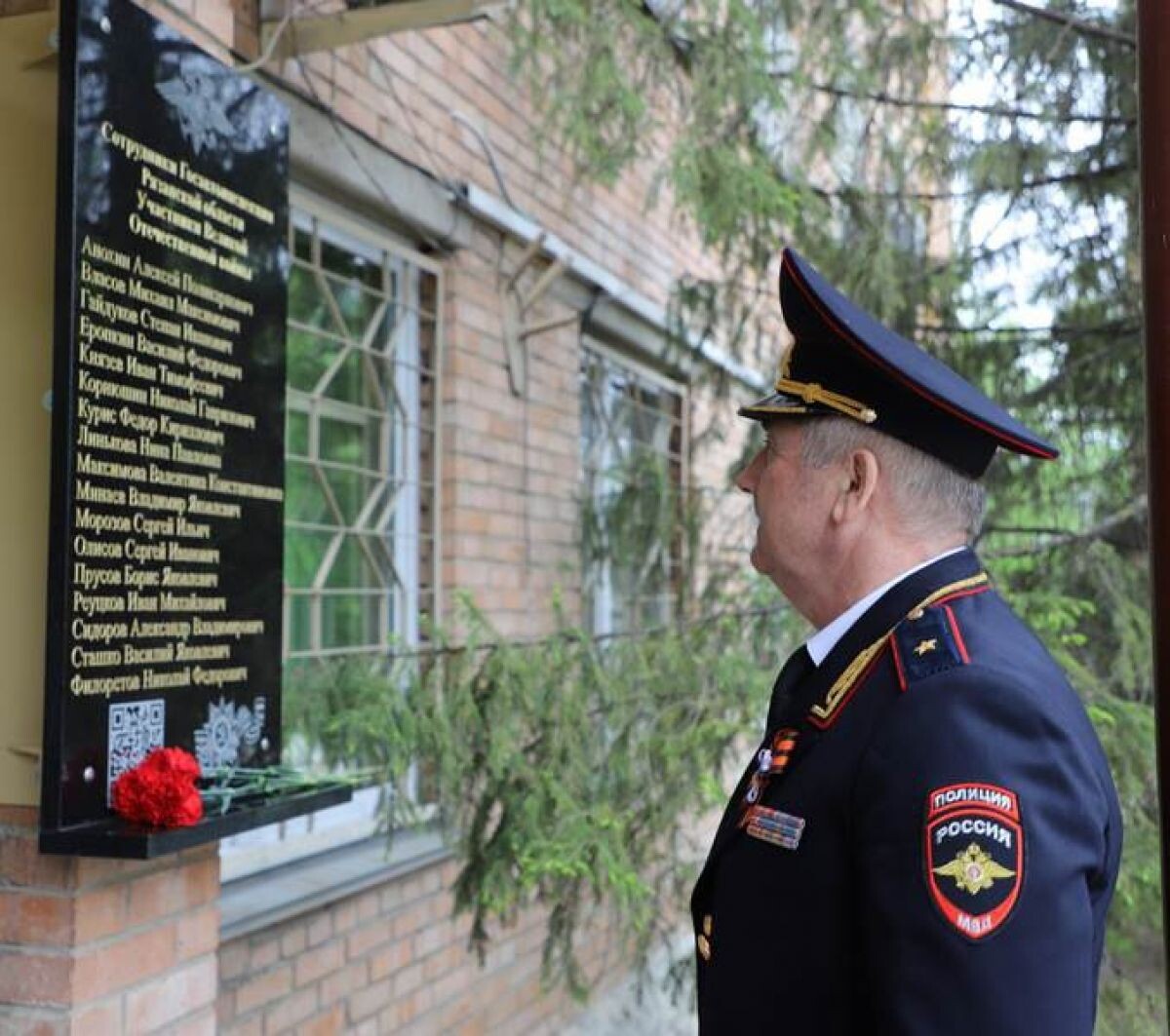 На фасаде здания Управления Госавтоинспекции УМВД в Рязани установили мемориальную доску участникам Великой Отечественной войны, проходившим службу в Госавтоинспекции. Об этом сообщает УМВД России Рязанской области. На памятной доске выбиты имена тех, кто стоял на защите страны в период Великой Отечественной войны, а после Победы продолжил служить Отечеству, став сотрудниками Государственной автомобильной инспекции. На доску также нанесен QR-код со ссылкой на сайт, где представлены фотографии и биографии. Присутствующие на торжественной церемонии открытия почтили память погибших воинов минутой молчания и возложили цветы к мемориальной доске. Фото: УМВД России Рязанской области.