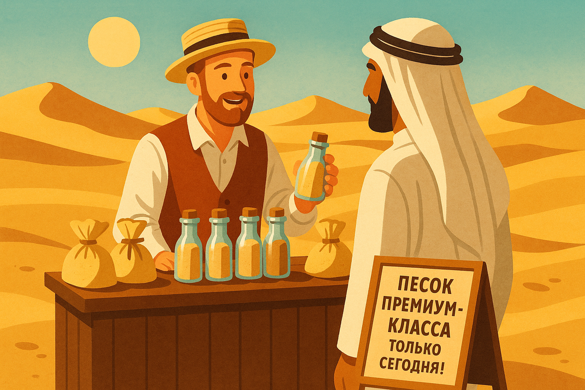 Как продать песок в пустыне: искусство убеждения и ценности Хочешь продавать что угодно, кому угодно — хоть песок в пустыне? Вот 5 принципов, которые превращают обычную продажу в искусство: 1. Пойми потребность, даже если её нет Люди покупают не товар, а решение проблемы. В пустыне песка много, но, может, не хватает фильтрованного, охлажденного, декоративного песка? 2. Создай уникальность Твоя задача — показать, чем твой продукт не такой, как у всех. Песок? Да. Но этот песок прошёл особую обработку, безопасен для детей, и используется в лучших отелях Дубая. 3. Упаковка решает всё Люди встречают по обложке. Упакуй товар так, чтобы захотелось взять его в руки. Песок в стильной колбе с гравировкой и историей происхождения? Уже не просто песок. 4. История сильнее фактов Расскажи, зачем ты это продаёшь. «Этот песок собран с места, где зародилась древняя цивилизация...» — и вот ты уже не продавец, а рассказчик и проводник в мир эмоций. 5. Продай не товар, а ощущение Люди хотят чувств