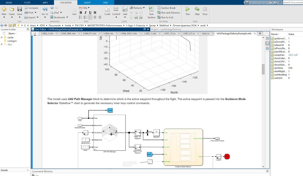 Для разработки систем управления дроном нужно постоянно проверять и отлаживать различные параметры управления. Для этого мы используем мощный программный комплекс MatLab, для создания и математического моделирования полета дрона.