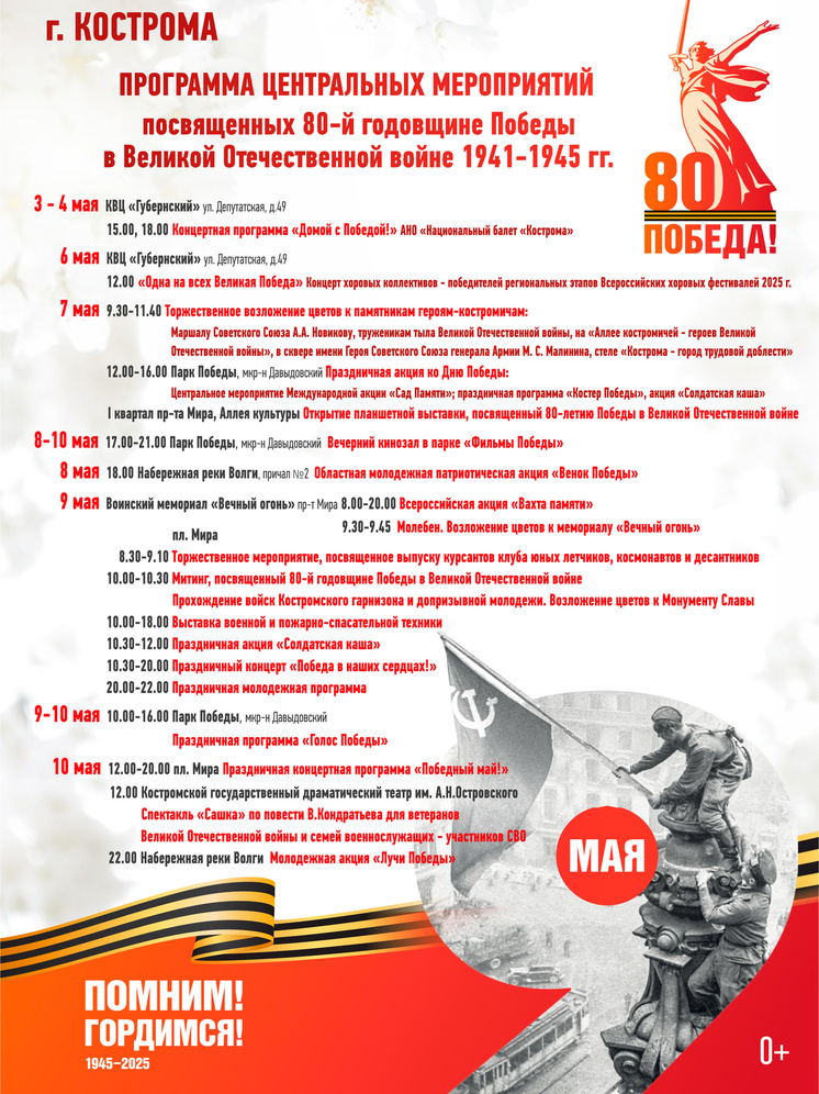 В Костроме стартовали мероприятия, посвященные 80-летию Победы в Великой Отечественной войне. Основные события запланированы на 8-10 мая.