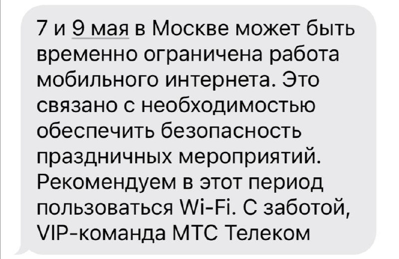 ⚡️В Москве не будет интернета с 7 по 9 мая операторы уже рассылают предупреждения клиентам Сеть будут отключать для «обеспечения праздничных мероприятий» Москвичи, трогаем траву CtrlAltDelights- подписаться