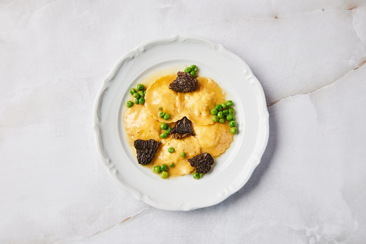 - Равиоли со сморчками (1290 руб.) — итальянские равиоли ручной лепки с начинкой из краба и тигровой креветки. Блюдо дополняется обжаренными сморчками, зеленым горошком и эмульсией из рыбного бульона со сливочным маслом;