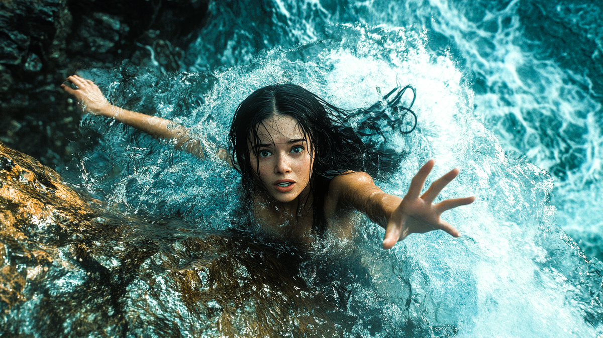 Не задумываясь, Хормез бросается вперёд. За ним Нино. Они хватают девушку за руки, пытаясь выдернуть её из мощного течения, которое тянет всё сильнее. Но сила воды невероятна: одного рывка хватает, чтобы трое молодых людей оказались полностью в её власти.