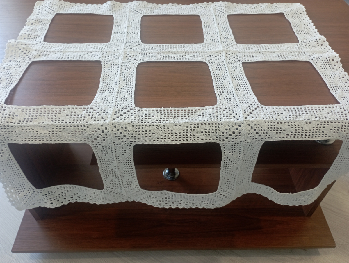Приветствую всех на своём канале! Я продолжаю свою работу над мини-скатертью. На данный момент у меня полностью готова вязанная кайма; сделана обвязка по всему периметру скатерти, постирана и отпарена. При отпаривании очень хорошо растягивала кайму, поскольку хлопок после стирки даёт усадку, примерно в 1см, а после отпаривания снова растягивается. Сейчас края немного волнистые, но в конце всей работы ещё раз буду отпаривать, и они станут более ровнее. Вообще, вязание каймы меня немного помучило. Если бы была просто сеточка, то вязать - без проблем. Но схема заставляет быть более внимательным. Чуть отвлечешься и не впишешься в рисунок. Несколько раз распускала, перевязывала и, естественно, больше времени затрачивалось на работу. Ещё я поняла, что лучше всё же сосредотачивать внимание на чём-то одном: либо вязать, не отвлекаясь, либо вышивать. Сейчас у меня в работе только вышивка. Думаю, что дела пойдут быстрее. Хотя я теперь совмещаю своё хобби с работой, всё же постараюсь надолго не