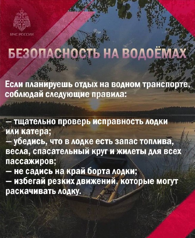 ▫️В выходные дни на водоёмах повышается риск возникновения чрезвычайных ситуаций в связи с активным использованием маломерных судов, употреблением алкогольных напитков и оставлением детей без надлежащего присмотра взрослых.
