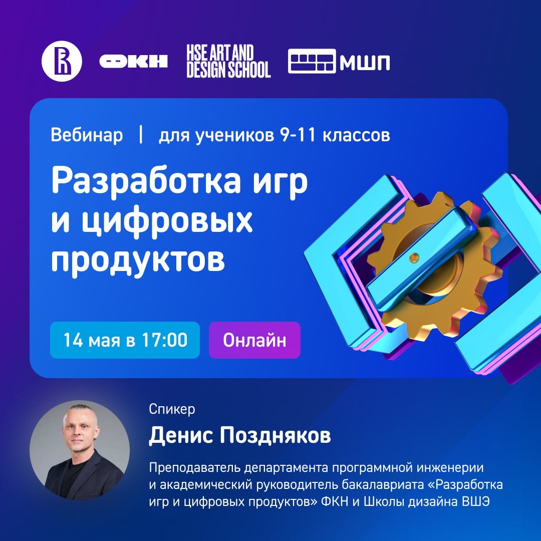 ❗️ 14 мая, в среду, в 17:00 Московская школа программистов приглашает вас на вебинар: «Как создать компьютерную игру, и из чего она состоит?» ❗️ 📣 Лектор: Денис Поздняков — преподаватель департамента программной инженерии и академический руководитель бакалавриата «Разработка игр и цифровых продуктов» ФКН и Школы дизайна ВШЭ. ✏️ О чём поговорим на вебинаре? – Что такое игра, и как придумать собственную? Узнаем, с чего начинается разработка и как рождаются идеи. – Из каких элементов состоит игра? Разберем структуру игр, включая механику, сюжет, графику и интерфейс. – Какие фреймворки используются в разработке игр? Познакомимся с самыми популярными инструментами и подберем подходящий для ваших идей. – А еще вы сможете обсудить свои задумки с экспертом и получить советы по их реализации! 🗓 Когда: 14 мая, 17:00 Вебинар рассчитан на учеников 9-11 классов. 🖥 Зарегистрироваться на вебинар можно по ссылке 🖥 Не упустите шанс заглянуть в мир геймдева и сделать первый шаг к созданию