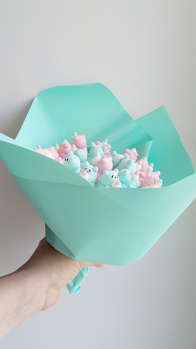 Поделюсь новостями. Подружка предложила идею: букет из маршмэллоу фигурок! Это и эффектно и необычно и ярко и мило. Она ещё в прошлом году советовала, но на тот момент я ещё едва ли дружила с массой маршмэллоу, чтобы она не растекалась в тонкую лепешку, какие там букеты. Я едва ли справлялась с тем, чтобы получить массу нужной мне консистенции. Так вот, решила я попробовать сделать букет. Сначала думала просто надену их на шпажки и делов. Но нет, все оказалось сложнее. Пришлось идти по пути создателей букетов из зефира. Вырезать круг из что-то вроде пенопласта (вероятно, это был пеноплекс). Снизу воткнуть шпажки по центру и краям. Далее сверху высадить фигурки, нанизывая их на зубочистки. Далее все это дело заворачивается в специальную бумагу. Результат на фото. Идея, конечно, годная, но хотелось бы её как-то доработать, а именно: Скажу честно, только никому не говорите: даже почувствовала желание посочинять зефирные цветы 🤭 Но я не люблююююю зефир. А как вам идея с букетом из