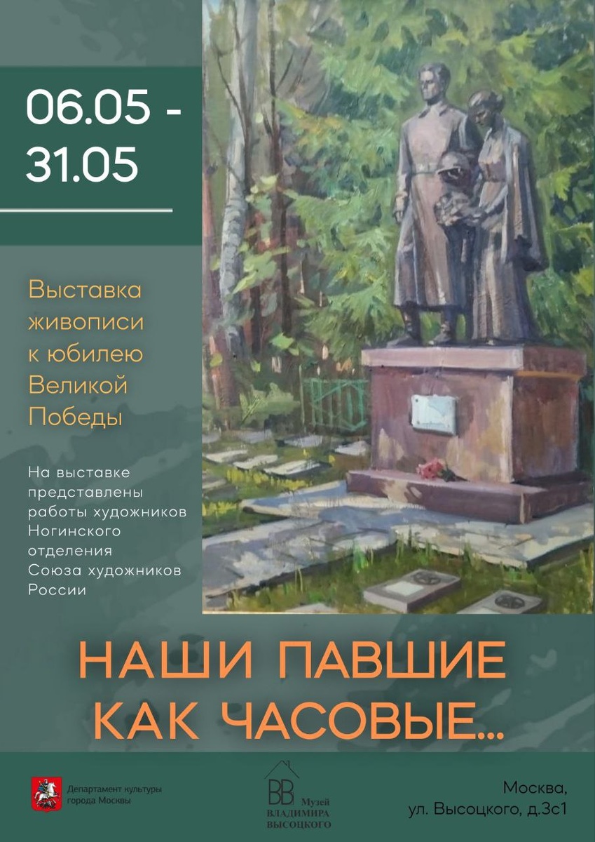 "Наши павшие как часовые" Большая дружба связывает Союз журналистов Подмосковья с Государственным музеем Высоцкого. В преддверии празднования 80-летней годовщины Великой Победы член СЖ Подмосковья Татьяна Прокофьева, выступила в качестве куратора выставки Ногинского отделения Союза художников России. Название выставки "Наши павшие как часовые"- фраза из известной песни Владимира Высоцкого. Организаторы приглашают членов СЖП посетить эту выставку и поздравляют вас с приближающимся праздником Великой Победы! Подписаться | Предложить новость
