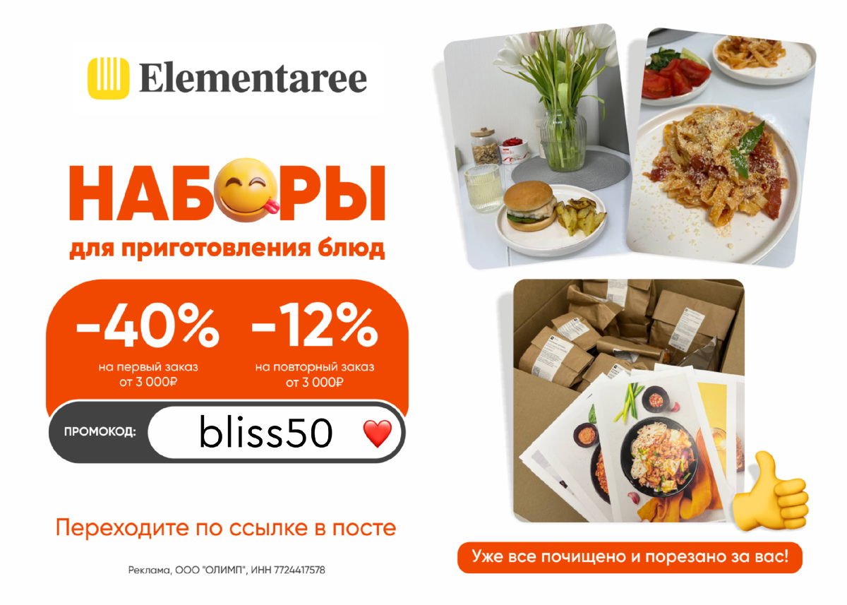 Elementaree — онлайн-сервис по доставке продуктовых наборов для приготовления ресторанных блюд. В наборе уже почищенные и порезанные ингредиенты, необходимые соусы и приправы, а также пошаговый рецепт с фото блюда.💥
