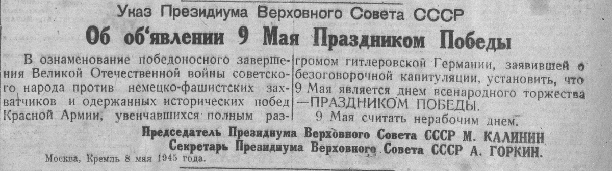 Указ Президиума Верховного Совета СССР Об объявлении 9 Мая Праздником Победы В ознаменование победоносного завершения Великой Отечественной войны советского народа против немецко-фашистских захватчиков и одержанных исторических побед Красной Армии, увенчавшихся полным разгромом гитлеровской Германии, заявившей о безоговорочной капитуляции, установить, что 9 Мая является днем всенародного торжества - ПРАЗДНИКОМ ПОБЕДЫ. 9 Мая считать нерабочим днем. Председатель Президиума Верховного Совета СССР М. КАЛИНИН Секретарь Президиума Верховного Совета СССР А. ГОРКИН. Москва, Кремль. 8 мая 1945 года. Источник: «Дагестанская правда» за 9 мая 1945 года