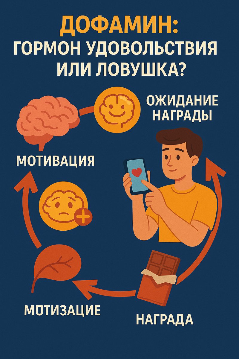 Почему ты хочешь ещё один ролик, ещё одну шоколадку, ещё 5 минут прокрастинации? Всё это — работа дофамина. Этот гормон делают героем продуктивности, но он же стоит за зависимостями и выгоранием. Разберёмся: дофамин — наш помощник или ловушка мозга? Дофамин — это нейромедиатор, который вырабатывается мозгом и участвует в системе поощрения. Он не даёт удовольствие, как думают многие — он вызывает ожидание удовольствия. Вот как это работает: 📌 Дофамин — это топливо мотивации. Без него мы бы не вставали с кровати. Проблема не в дофамине, а в доступности удовольствий. Быстрые дофаминовые "пинки" в современном мире — на каждом углу: ⚠️ Мозг привыкает к лёгкому вознаграждению — и перестаёт получать удовольствие от долгосрочных целей. Отсюда: «Чем легче дофамин — тем меньше удовольствия от жизни в целом». Ты не можешь "отключить" дофамин. Но можешь поменять источник. 🔄 Что делать: 💪 Учись получать удовольствие не от новизны, а от процесса. Можно — при чрезмерной стимуляции. У людей с наруш