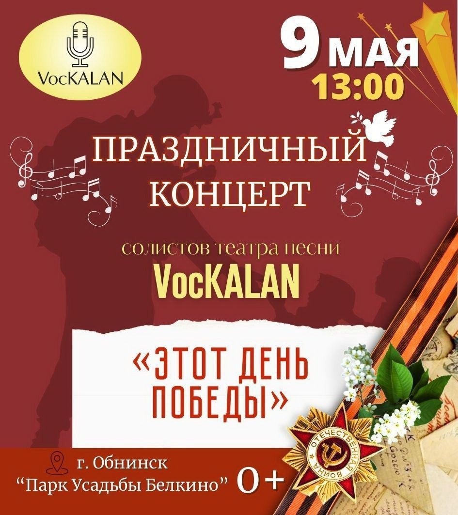 9 мая с 13:00 до 15:00 на эстраде в парке «Усадьба Белкино» пройдёт праздничный концерт «Этот День Победы» солистов театра песни «ВокКАЛАН