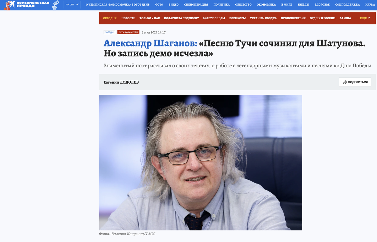 Сегодня КОМСОМОЛКА опубликовала мою беседу с Александром Шагановым, выбрав для заголовка финальный эпизод разговора: