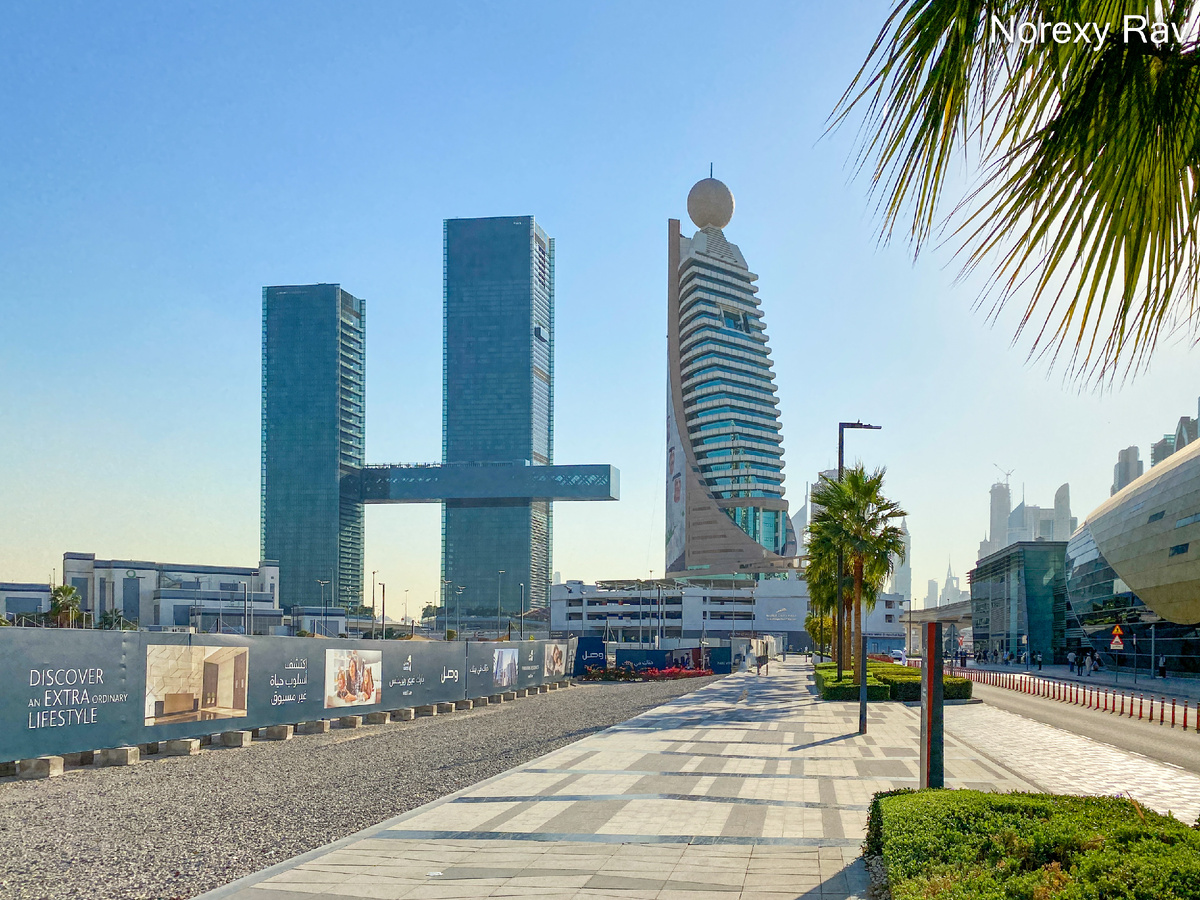 В один из дней решил посетить Дубайскую Рамку, на неё тоже можно купить экскурсию, но можно без проблем добраться самому на метро, пройдя 10 минут до места, и как раз по пути посмотреть на другие высотные здания интересной архитектуры. Дубайская Рамка построена в 2018 году, и как-бы символично разделяет город на две части, современную и старую часть города. Её высота 150 метров, а ширина 93 метра, и из далека кажется что там совсем мало места) При входе на кассе информируют, что ждать очереди что-бы пройти и подняться наверх столько-то времени, в моём случае было 40-60 минут. Подумал, что типа да ладно, пройду быстрее, но оказалось что действительно? быстрее не получится (если конечно ты не VIP), очередь большая, сначала нужно простоять что-бы попасть на территорию, а потом за поворотом, ещё подождать когда запустят в здание. Пока стоял в очереди рассмотрел интересный рельеф обшивки здания "золотистого" цвета. Простоял точно около 40 минут, и наконец нас пустили во внутрь. Работники