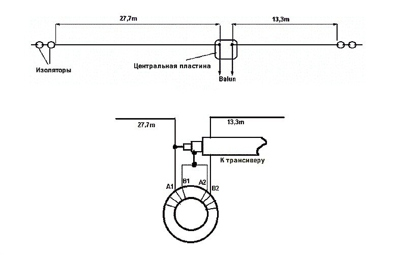 Широкополосная КВ антенна 🔹 Не всегда возможно растянуть антенны для каждого диапазона отдельно, но тогда можно использовать простую многодиапазонную антенну в виде несимметричного диполя, питаемого через согласующий трансформатор (BALUN = BALanced, Unbalanced) коаксиальным кабелем с сопротивлением от 50 до 75 Ом. В экспериментальной версии использовался 75-омный кабель, бывший телевизионный. 🔹 Для изготовления проволочных антенн в прошлом часто использовали бронзовую проволоку, но сейчас её сложно найти. Поэтому обычно применяют медную проволоку, хотя она имеет недостаток — со временем растягивается и затвердевает. Читать далее >>