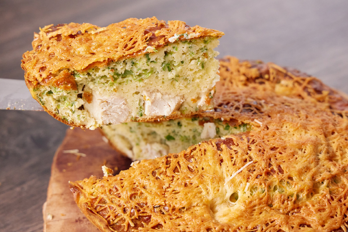 5. Достаньте пирог, посыпьте тёртым сыром и выпекайте ещё 10 минут. Остудите, нарежьте на порционные куски и подавайте.