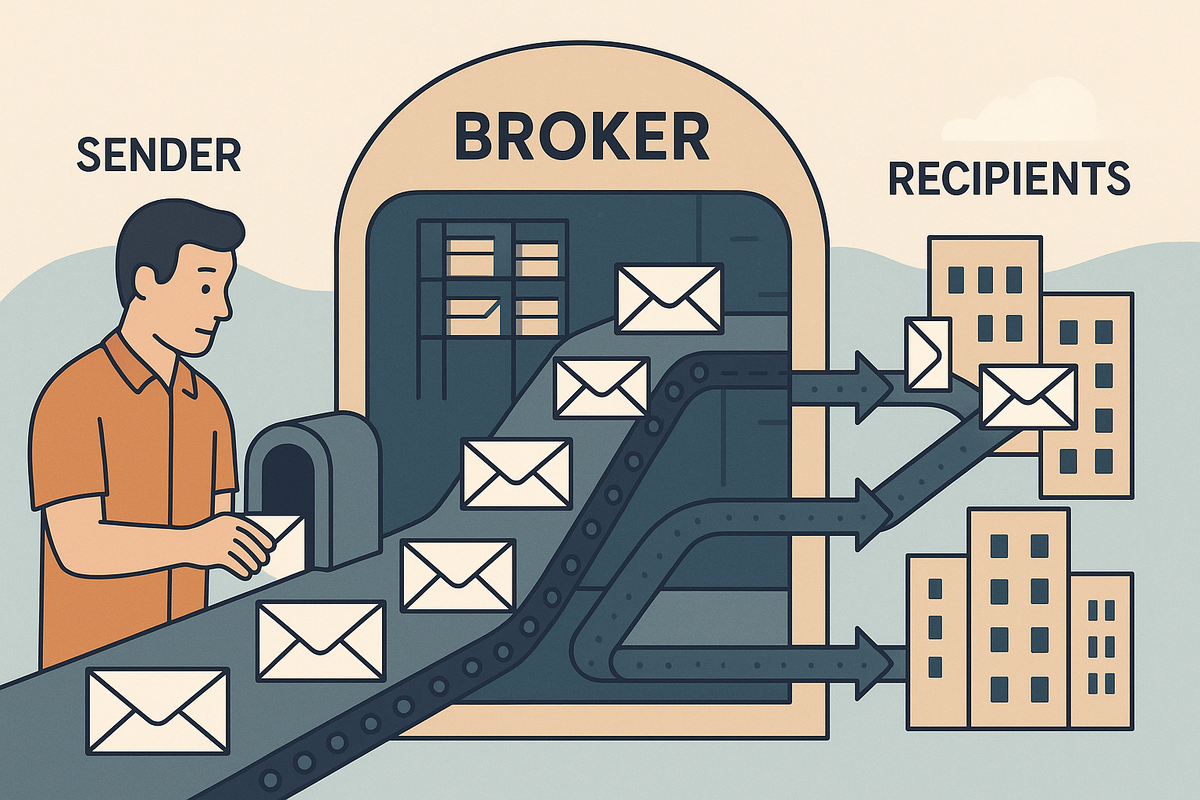 Представьте брокер сообщений как почтовое отделение. Отправитель (продюсер) опускает письмо (сообщение) в ящик – он не беспокоится, где сейчас получатель и готов ли он принять письмо. Почтовое отделение (брокер) получает все письма, сортирует их и хранит, если нужно, а затем раздает получателям (потребителям) когда они готовы забрать почту. Получатели могут прийти в удобное для них время – письмо будет их ждать. Такая система избавляет отправителей и получателей от необходимости быть на связи одновременно и знать подробности друг о друге.