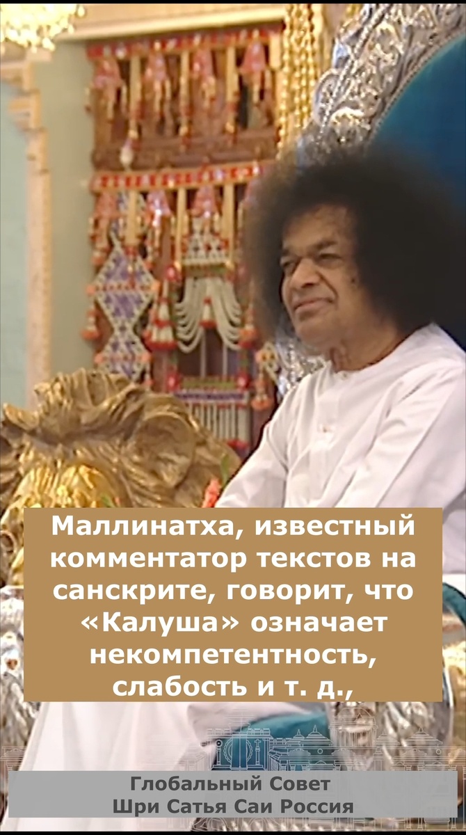 108 имён Шри Сатья Саи Бабы К 100-летию Бхагавана мы продолжаем воспевать 108 имён Шри Сатья Саи Бабы! 47. Ом Шрӣ Сāи Калуша Видӯрāйа Намаха Маллинатха, известный комментатор текстов на санскрите, говорит, что «Калуша» означает некомпетентность, слабость и т. д., а также изъян и недостаток. «Видӯра» означает «отдалённый». Таким образом, это имя указывает на то, что Баба лишён недостатков и изъянов. Он имеет все компетенции, всесильный. Он всезнающий, всемогущий. Его воля должна приносить результат, невзирая на все препятствия. «Моя Cанкальпа должна приносить плоды», – говорит Баба. «Я никогда не совершаю бессмысленных поступков и не говорю слов, которые не имеют существенного значения», – говорит Баба. Баба совершенен во всех отношениях. Он всемогущий. По Своей воле Он может совершить всё, но Он предпочитает, как Он говорит, «чтобы всё было сделано вами самими своей собственной обученной и очищенной волей и мастерством”. Как могут изъяны и недостатки запятнать целост