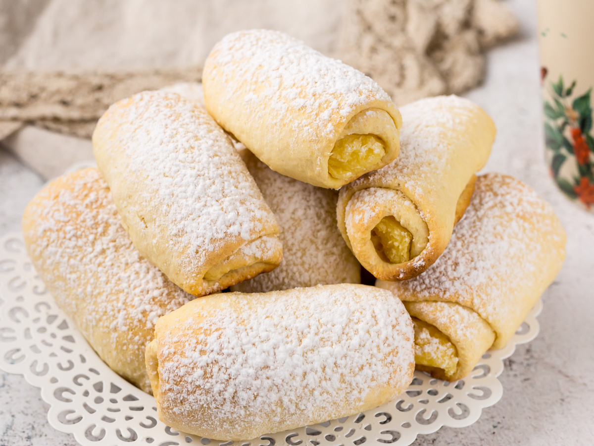 Делим тесто на 16 частей. Каждую раскатываем в овал, на край кладём ложку крема и аккуратно заворачиваем в рулетик. Швом вниз укладываем на противень с пергаментом. Выпекаем при 180°С 15–20 минут, до лёгкого румянца.