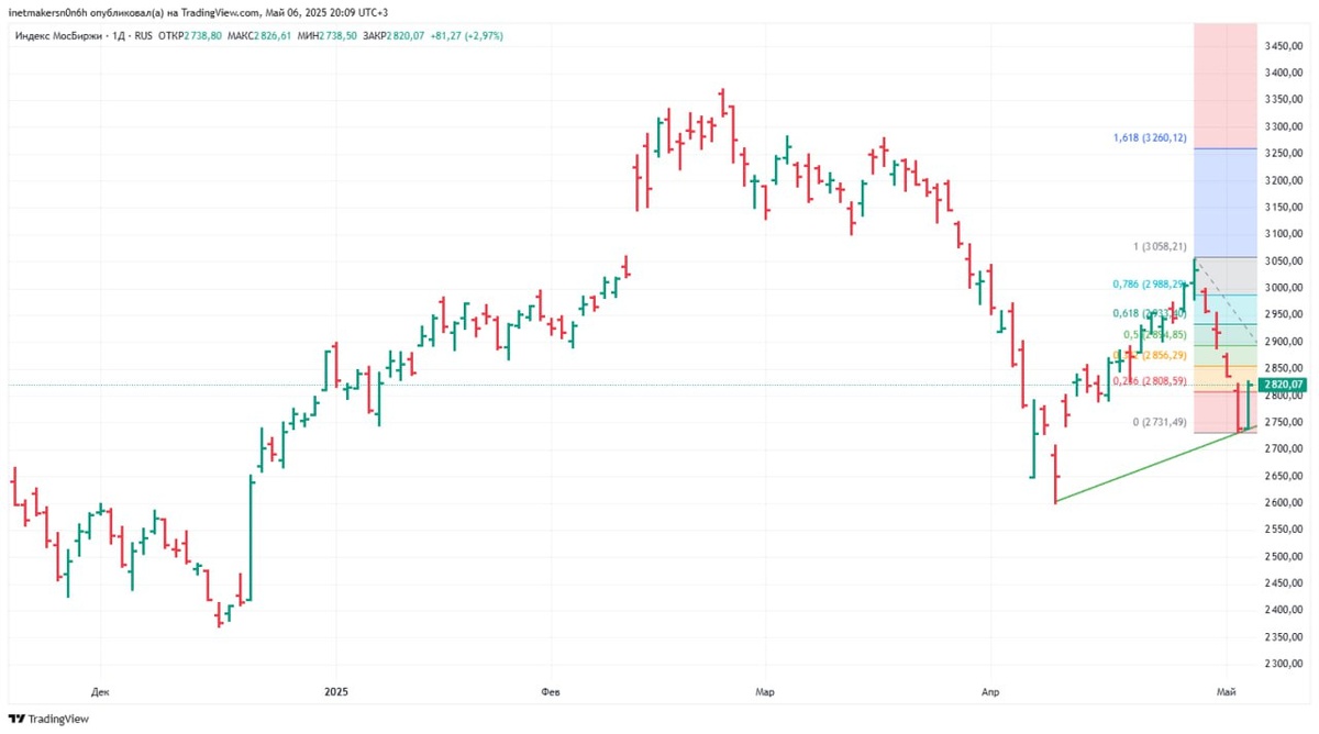 ❗️6 мая российский фондовый рынок вырос, индекс МосБиржи укрепился на 2,97% до уровня 2820,07. Рост сегодня начался с самого утра, при этом где-то после 9 было даже ощутимое снижение, причем на достаточно больших объемах торгов. Однако, тенденция к росту сегодня все же возобладала и смогла оставаться актуальной в течении остального дня. Если посмотреть на график индекса МосБиржи можно заметить, что российский фондовый рынок сегодня развернулся вверх, аналогичная ситуация в большинстве ликвидных бумаг российского рынка, что позволяет нам надеяться на продолжение роста завтра. 👉 Наш российский 🇷🇺 портфель — индекс FTinvest.ru прибавил 1,49% и достиг уровня 781,9665, зарабатывайте вместе нашим индексом FTinvest.ru с услугой автоследования. Курс доллара США по данным ЦБ РФ сегодня снизился на 1,16% и составил 80,9644 руб. Нефть WTI выше на 3,55% до $59,16 за баррель, а Brent на 3,19% и стоит $62,15. Золото сегодня выше на 2,87% и стоит $3417,74 за тройскую унцию. Биткойн растет н