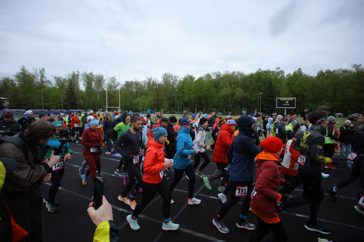 Последний час очень быстро пролетел. Тем более нас очень рано позвали на построение перед стартом. Пришлось мерзнуть. Мною было предложено стоять и обниматься, пока не дадут старт, но Лена З. не оценила 😢 пошла дрожать в заднем ряду, так как записалась в любители, а не на ЧР (чемпионат России). У них своя линейка и свой круг на стадионе. Наш был внешний по ~420м.