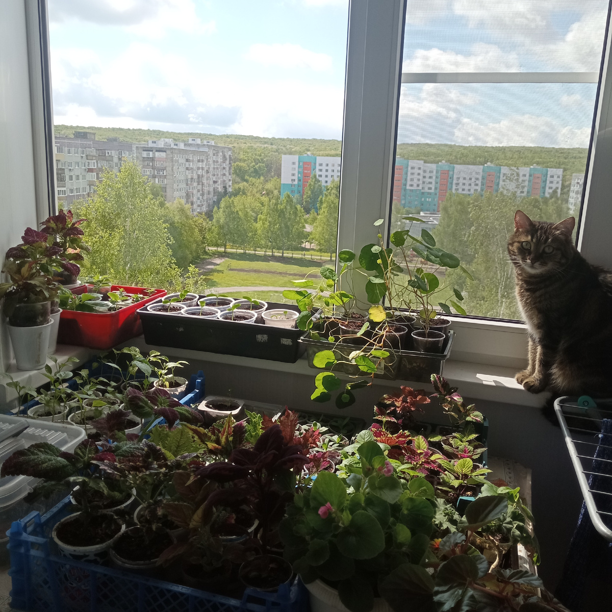 Вышла на лоджию, там тепло, +25. Форточка стоит на микро-проветривании, рассаде хорошо. В квартире сейчас и то холоднее. Решено, выключаю подсветку и переношу все остальные растения на лоджию. Разложила стол, всё прекрасно поместилось. Кот Симка тут как тут, сел охранять)). Интересно от кого))? От самого себя навряд ли. Все эти листочки его не интересуют, это не его вкуса зелень. Я спокойна, пусть сидит греется.