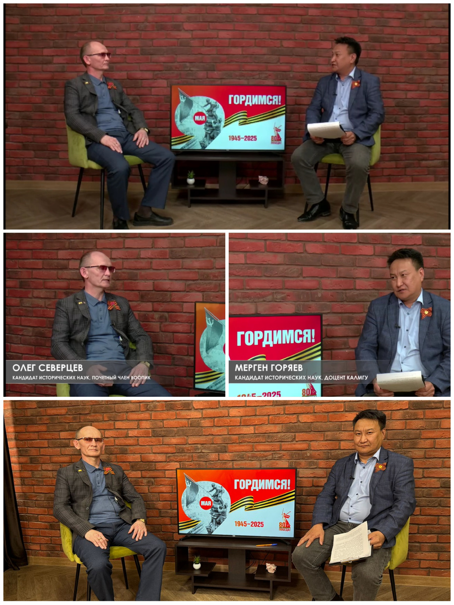 "Все народы Советского Союза внесли огромный вклад, никто себя не жалел, все работали на общую Победу". /Владимир Путин. Вот в таком лейтмотиве #сегодня с кандидатом исторических наук, доцентом КалмГУ имени Б.Б. Городовикова уважаемым старшим коллегой Мергеном Саналовичем Горяевым мы в прямом эфире Национального телевидения Калмыкии говорили: - о единстве народов СССР в борьбе с гитлеровской Германией; - о вкладе калмыцкого народа и Калмыкии в Великую Победу; - о том как и почему на Западе пытаются фальсифицировать предпосылки, причины, ход и итоги Второй мировой войны и Великой Отечественной войны; - о бесценной помощи братских Тувы и Монголии Советскому Союзу в борьбе с нацистским агрессором; - о том, как защищать Победу и память о подвиге наших деловых и прадедов от фальсификации. Благо Дарю руководству и сотрудникам Национального телевидения Калмыкии за приглашение на передачу "Великая Победа многонационального СССР" и возможность поделиться со зрителями своими мыслями и чувством