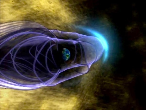 Солнечный ветер воздействует на магнитное поле Земли В концепции художника солнечный ветер, изображенный золотым цветом, отклоняется магнитным полем Земли, изображенным фиолетовым цветом. Синий полумесяц иллюстрирует ударную волну, когда магнитное поле Земли резко поворачивает солнечный ветер. Такая картина наблюдалась вокруг Земли в течение последних суток, поскольку солнечный ветер из корональной дыры воздействовал на нашу планету, вызывая геомагнитную бурю G1 (малую). Сегодня возможны дополнительные помехи, поскольку сильный солнечный ветер продолжает усиливаться.