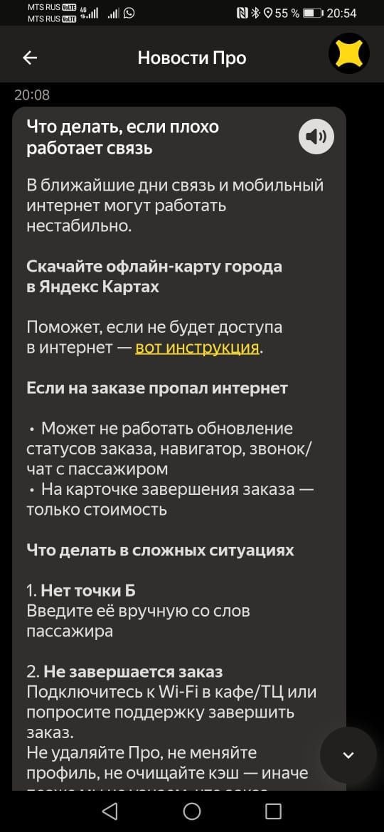 Что делать, если плохо работает связьВ ближайшие дни связь и мобильный интернет могут работать нестабильно. Скачайте офлайн-карту города в Яндекс Картах Поможет, если не будет доступа в интернет — вот инструкция. Если на заказе пропал интернет • Может не работать обновление статусов заказа, навигатор, звонок/чат с пассажиром • На карточке завершения заказа — только стоимость Что делать в сложных ситуациях 1. Нет точки Б Введите её вручную со слов пассажира 2. Не завершается заказ Подключитесь к Wi-Fi в кафе/ТЦ или попросите поддержку завершить заказ. Не удаляйте Про, не меняйте профиль, не очищайте кэш — иначе позже мы не узнаем, что заказ выполнен. 3. Не получается выйти на линию/уйти с линии Дождитесь стабильного доступа в интернет. 4. Не согласны со стоимостью заказа Она может пересчитаться, когда будет стабильный интернет. Проверьте её позже, если остались вопросы — обратитесь в поддержку. Из-за нестабильного интернета может быть много обращений в поддержку — возможно
