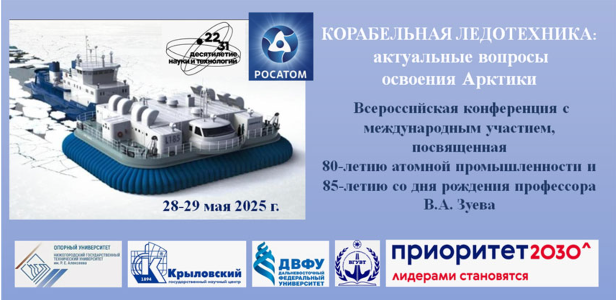 85-летию со дня рождения профессора В.А. Зуева 28-29 мая 2025 г. в Нижегородском государственном техническом университете им. Р.Е. Алексеева состоится Всероссийская конференция с международным участием «КОРАБЕЛЬНАЯ ЛЕДОТЕХНИКА: АКТУАЛЬНЫЕ ВОПРОСЫ ОСВОЕНИЯ АРКТИКИ», посвященная 80-летию атомной промышленности и 85-летию со дня рождения профессора В.А. Зуева. Конференция проводится в рамках Десятилетия науки и технологий в Российской Федерации и программы «Приоритет–2030». Целью конференции является обмен информацией по состоянию исследований в области корабельной ледотехники и смежных наук, выполняемых научными, научно-техническими и другими коллективами, а также определение приоритетных направлений фундаментальных и ориентированных научных исследований, нацеленных на решение задач освоения и рационального использования ресурсов Арктики и Антарктики. Актуальность тематики конференции «Корабельная ледотехника: актуальные вопросы освоения Арктики», опр