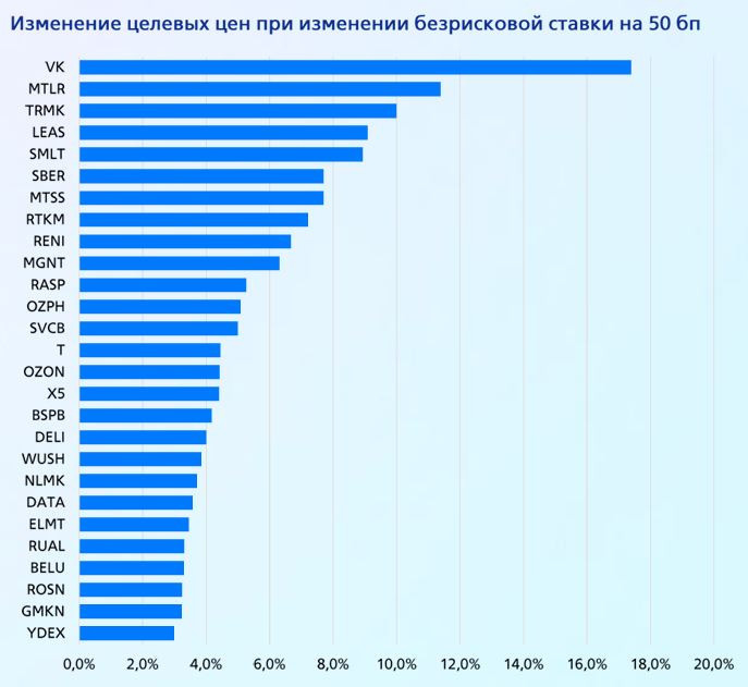Чем выше акция на графике - тем сильнее она переоценится вверх на снижении ставки. Например, ТМК (TRMK) - при снижении ставки на 0.5% должен вырасти на 10%. При снижении на 1% - соответственно на 20%.