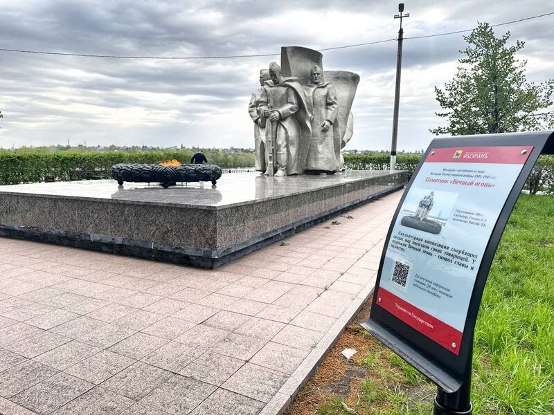 Особое внимание привлекают стойки на территории мемориального комплекса. Они установлены у братских захоронений воинов, умерших в сызранских госпиталях в годы Великой Отечественной войны, у монумента погибшим воинам-интернационалистам и у Вечного огня. Изображение украшает герб Сызрани. Надпись на стойке поясняет идейное содержание знакомого каждому сызранцу памятника воинам, склонившимся в скорбном молчании у могил павших товарищей. QR-код на стойке ведет на сайт ЦМИиК, где любой желающий сможет прочесть подробную информацию об объекте, которые вызвал его интерес.