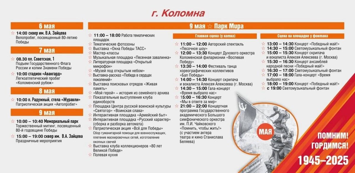 Афиша мероприятий в Парках Коломны на 9 мая 2025 года